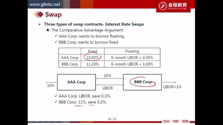 这道题有两个疑问。第一个:为什么当LIBOR=10%的时候,说AAA赚了0.3?既然AAA先从银行买的10%的固定利率,和LIBOR=10%比,应该不赚不赔?第二个问题,就是利率互换的双方会不会有人违约,跳出swap?比如这个例子,假设LIBOR=8.9时,BBB从该国银行买的浮动利率是9.9%,比10%还低,那BBB是否会违约跳出swap?同理,当LIBOR=11%的时候,AAA会不会宁愿选择10%的固定利率,然后违约不与BBB做swap?