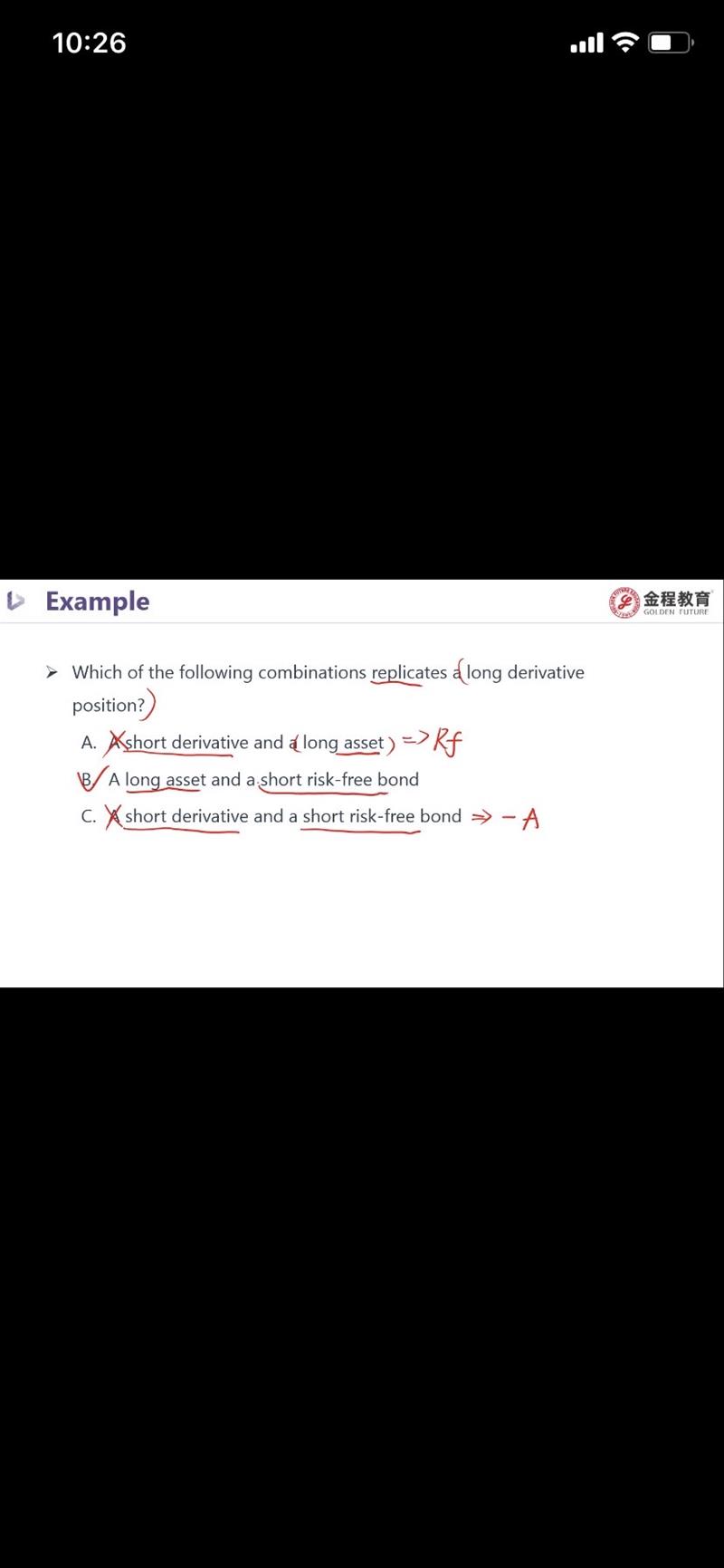 asset-riskfree asset=-derivative。B选项不是应该为short derivative吗?题干是long这个怎么理解?