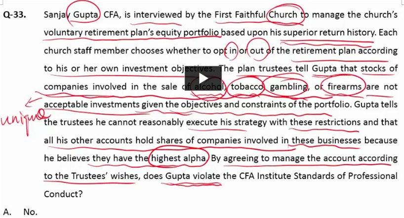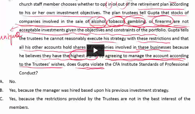 请问对于这道题中,客户是对于CFA的历史投资业绩选择让他做投资的,但是在题干中说到,他对于其他的客户投资那些教堂不想投资的类别,并取得了很好的收益。并且他说他不能合理的执行教堂提出来的限制的投资政策,但是后来又说同意去进行这样的限制投资,我总感觉前后有冲突,如果CFA接受了这样的投资,会不会对于他其他的投资烟酒军火客户造成利益影响?