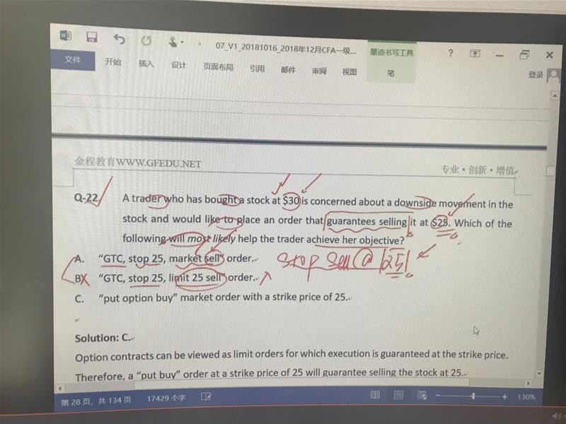 老师你好,这题意思是交易员确保股票在25卖出,选项B stop 25 limit 25 sell表达的意思是交易指令在股票价格低于25的时候有效并且limit at 25不就是指的25这个点位吗?选项c也是同样的一个意思