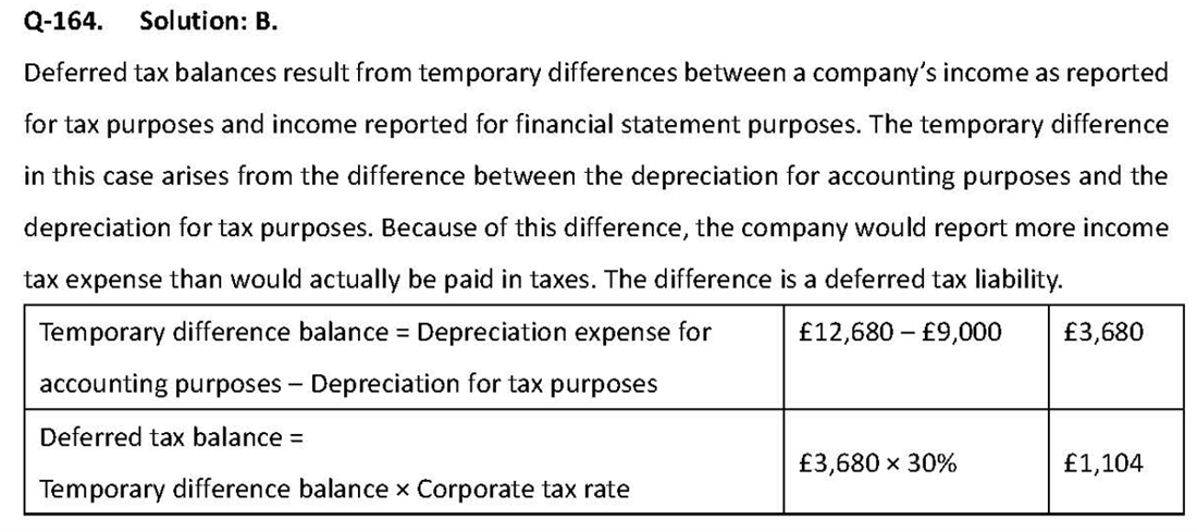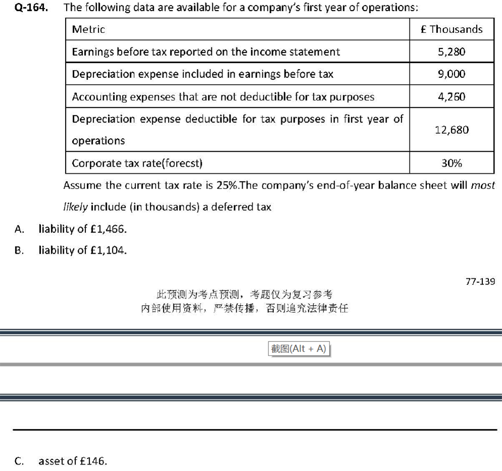 请问老师,百题Q-164不理解,请解释。答案非常令人困惑。。。。。 按照题目意思,当年会计税前利润=5280,税前利润中包含的折旧费=9000,其他不可抵扣的会计费用=4260,可抵扣的折旧费=12680. 首先:税前利润 小于折旧费,不论减去9000,还是减去12680,都是亏损的,都不该交税。应该产生DTA. ----答案为啥是 DTL?? 第二:会计报税,到底是要扣减哪个 折旧费呢? 5280-9000, 还是5280-12680? 按我的理解,会计报税,当然是按会计原则,尽量能抵扣多少就抵扣多少,应该是5280-12680. 那么会计少计利润,少缴税。反之,税法则是多计利润多交税,也应产生 DTA。 第三:会计报税按照 预计的公司所得税率=30%计算,得出income tax expense。然后拿到税务局 去 核对,然后实际交税。那么 题目中 assume current tax rate =25%,这个较低的税率在何处 得以体现? 是实际交完税以后,公司回来自己调整账目用(按资产负债表日后事项处理)? 还是在 与税务局核对的当时现场,就 将 30% 改为 25% 重新算一个 tax payable 数字,就按其 实际缴费呢? 请老师解释。 题目的纳税流程是美国 的,毕竟与中国不同,所以有很多流程,时间节点上的 误解和困惑,请老师详细解释,谢谢~