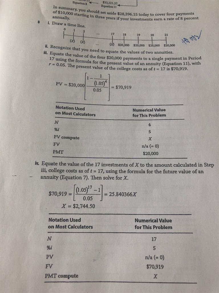 老师 请问先付年金和后付年金怎么区别呀?对于第八题,关于学费问题,costs at beginning of each year, 所以我用BGN模式,N=4,i=5,FV=0,PMT=20,000求 PV,但去看答案,发现答案用的是后付年金,我就没懂了。请老师详细解释一下,感谢(图一是问题,图二是答案)