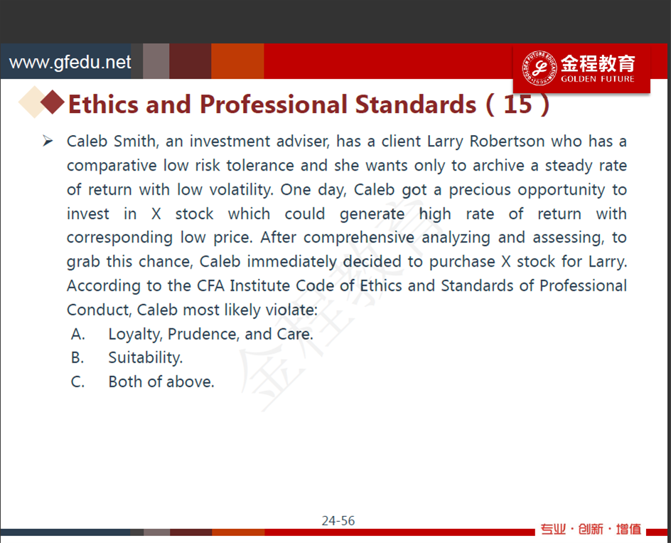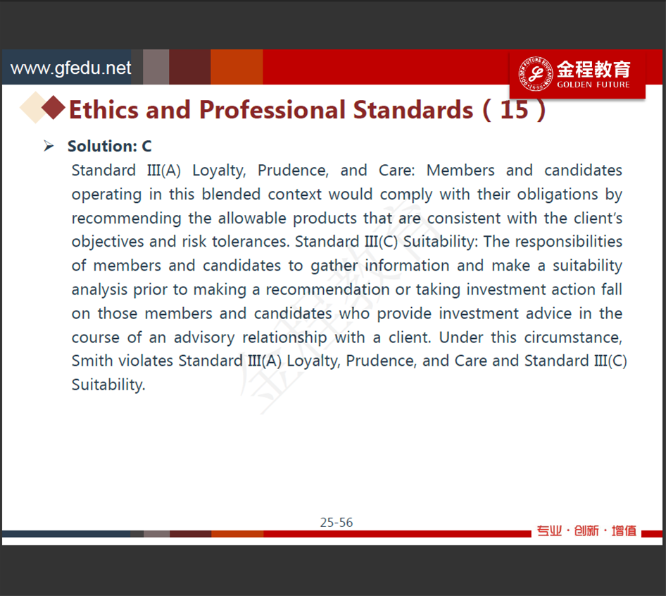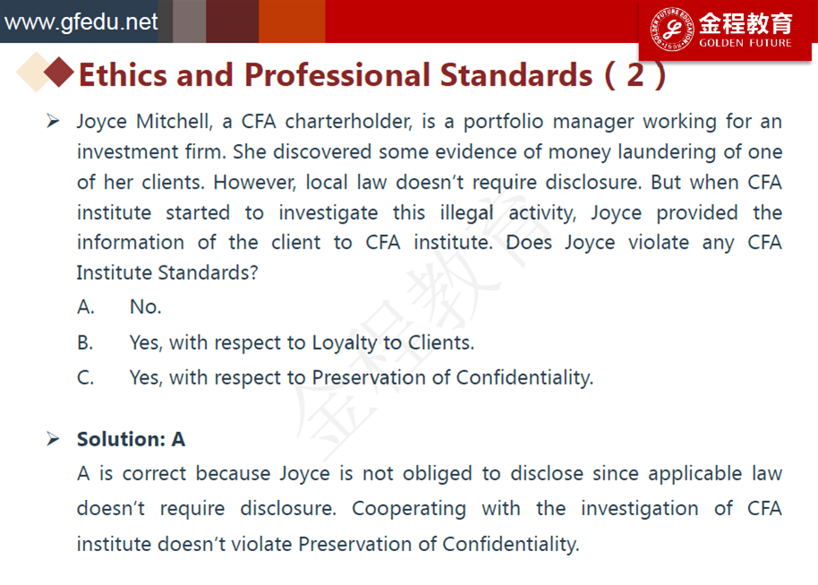 老師您看我這樣分析的對不對。協會和當地法律有衝突的按照當地法律。兩個都有規定(同向認爲是違法的)按照最嚴格的法律。那麽如果當地法律允許的行爲是違法市場誠信的也是要遵守的對麽,就像這道例題,選擇沒有違反?但是好像這道題考的是disclose這個行爲本身,貌似有點找不到本質了麻煩説下思路謝謝。