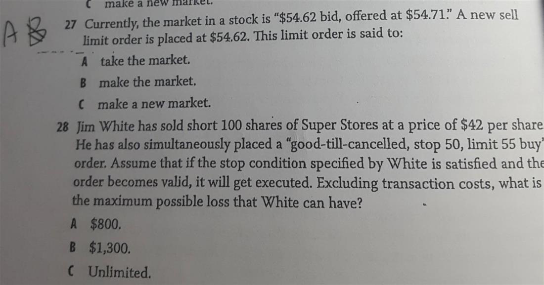 想问下图片上27题,看答案是A,但是上课时候老师讲take the market 不是LIMIT BUY, MAKE THE MARKET 就是用BEST BID成交的订单,TAKE THE MARKET 一般是高于BEST BID的价格,这题就是用BEST BID成交的,所以不明白为什么B不对