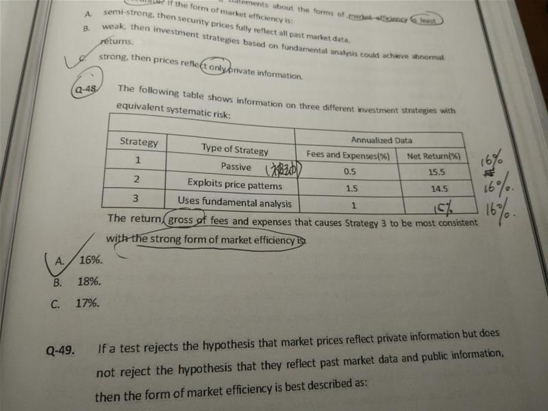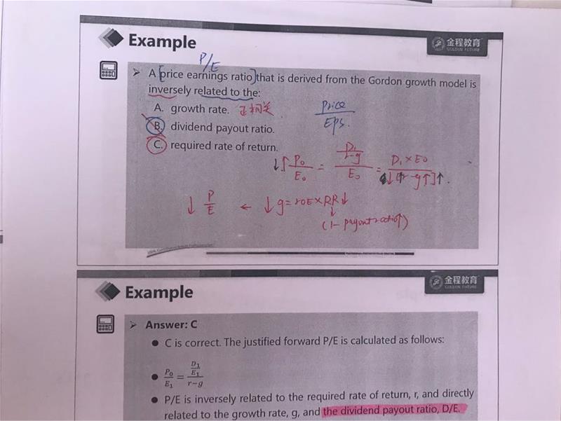 老师您好,这个题我对B有疑问,我是这样考虑的:RR=1-payout ratio,如果payout ratio大,那RR就会变小,从而g变小;g变小,P/E就会变小。那因此payout ratio和P/E是反向变化关系。我这个思路的问题在哪,麻烦老师解答谢谢