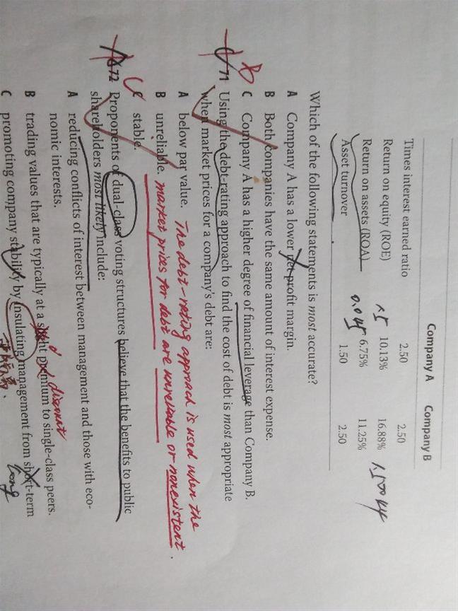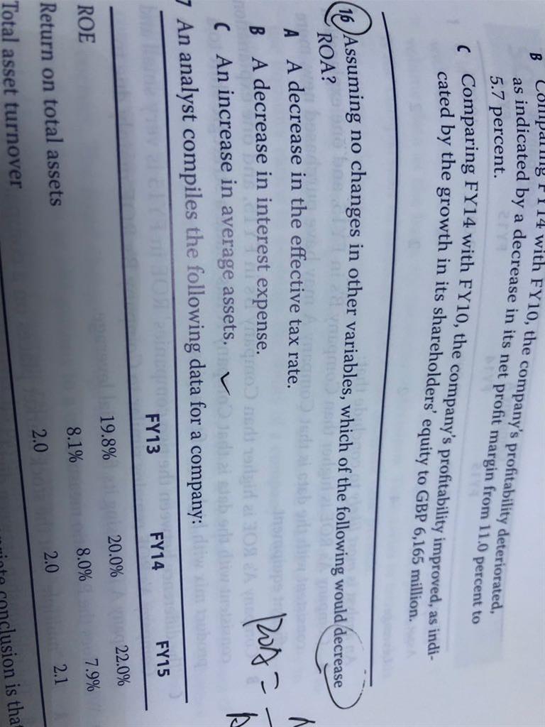 老师,请问第16题,ROANI+INT+TAX/average total assets,那Int的减少不是应该引起ROA的减少吗?为什么B不对呢?