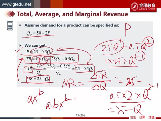 你好,老师 MR=25-Q=△TR/△Q 1.△TR是求TR的一阶导=1×25×Q¹-¹ 减 2×0.5×Q² -¹ 2.那么△Q的一阶导=1×1×Q¹-¹=1吗? 上课时老师只讲了1部分,2部分没讲。 请帮忙解答,谢谢。