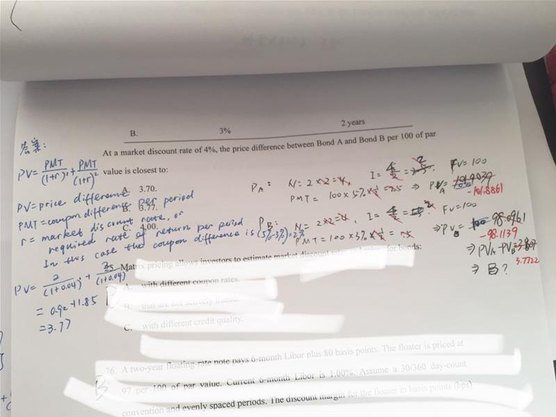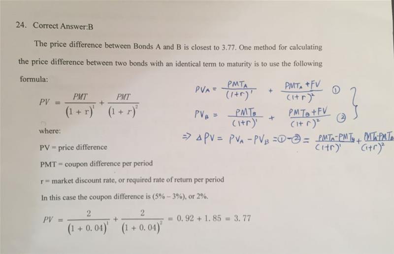 老师好 这道题答案中给到了一个公式,直接用coupon的差额代入公式算出了pv的差额,我对这个公式不太有印象,自己用蓝笔推了一遍(图3右侧蓝色笔迹),请问思路是否正确
