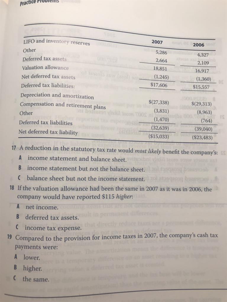 T18 为什么选c?valuation allowance上升导致dta减小 然后应缴的税少了 income tax expense不是应该减少吗? T19 为什么选b?