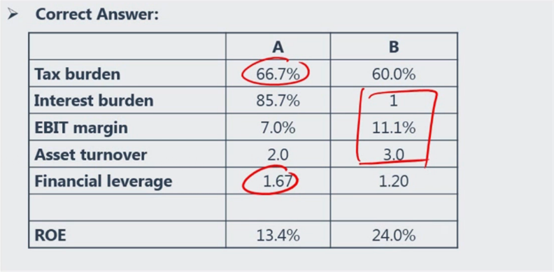 老师,请问financial leverage这里不是相对来说越低越好么?Tom Han说的是A在financial leverage 优于B,这是何解?(杜邦分析)