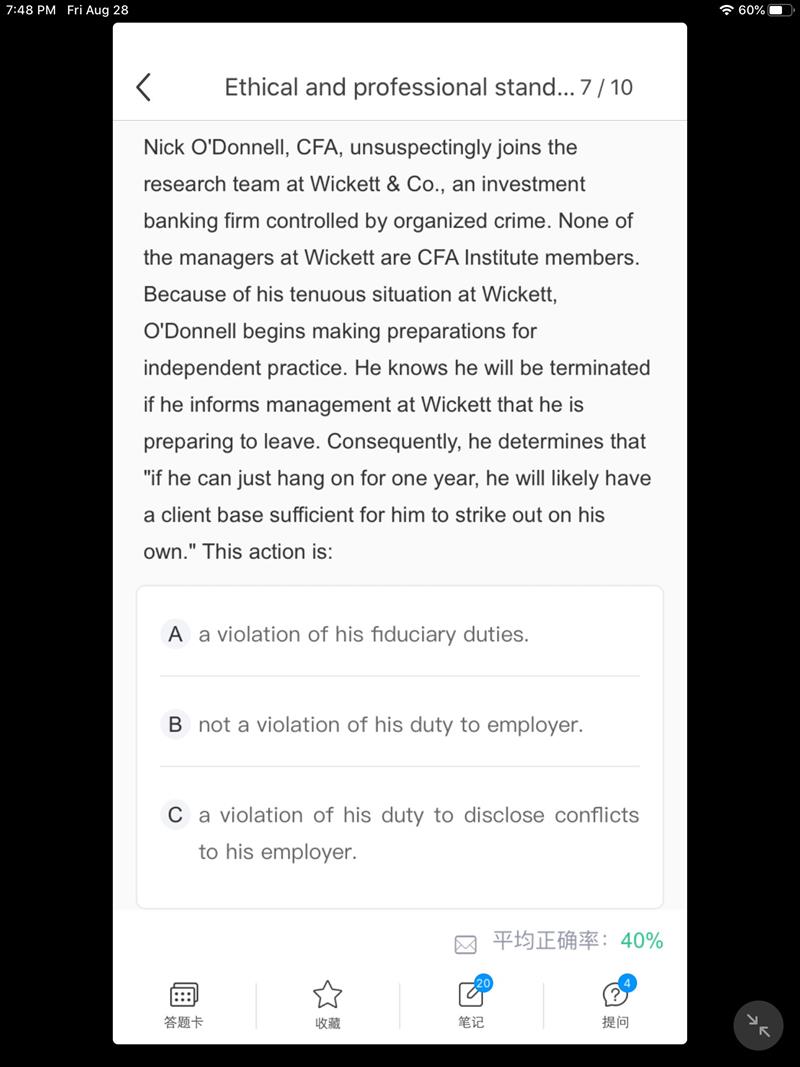 老师 这家公司是个犯罪集团 那Nick 不是应该要为 public 公众利益和客户安全考虑 而去揭发吗?这难道不算A选项吗? 如果B选项是对的话 也就可以理解为CFA持证人是被允许在犯罪集团内工作的?!明知是犯罪集团 也可以继续工作一年的??