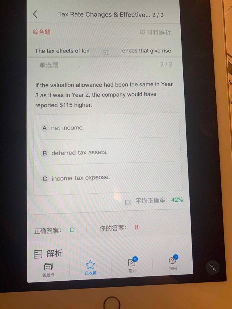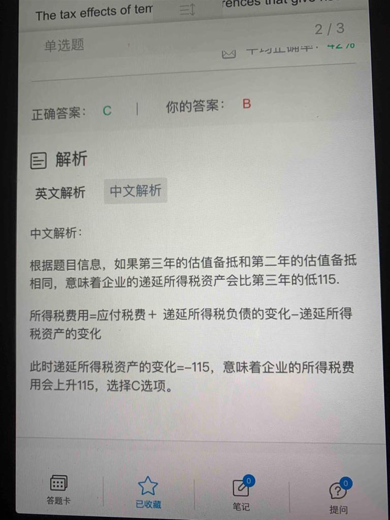 老师 这题C是对的 可是为什么B是错的呢 Allowance 在 financial report 会体现减去115,但 tax report 不会体现,所以今年交的税多 从而进入DTA,所以DTA上涨 这个没有错呀