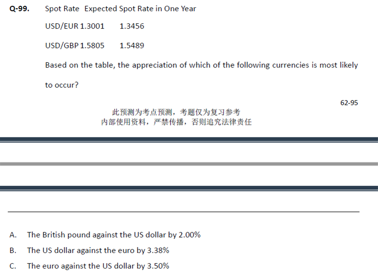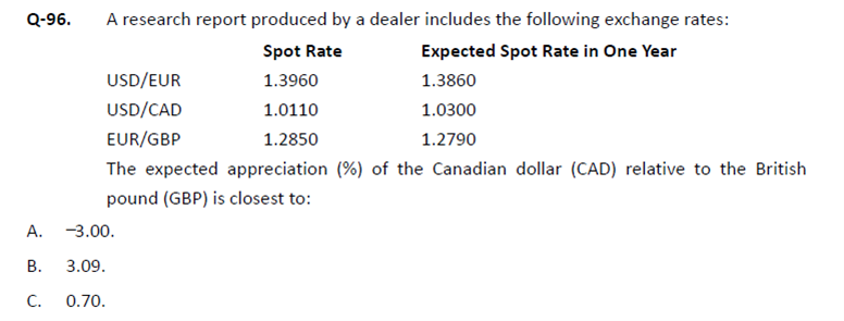 Q-96 计算出CAD/GBP的spot rate是1.774, expected spot rate是1.721.这种标识方法是以GBP为base currency进行标识,而题目中求解的base currencys是CAD,故表示方法应该是GBP/CAD,与之对应的spot rate和expected spot rate是1:1.774和1:1.721,此处可以看出CAD在升值,升值比例(1/1.721)/(1/1.774)-1=3.09%。不知道这题这么理解是否有问题,请老师帮忙解释下,谢谢。 Q-99主要问题是答案中的描述没理清谁是base currency. Eg, The British pound against the US dollar,请问哪个是base currency?