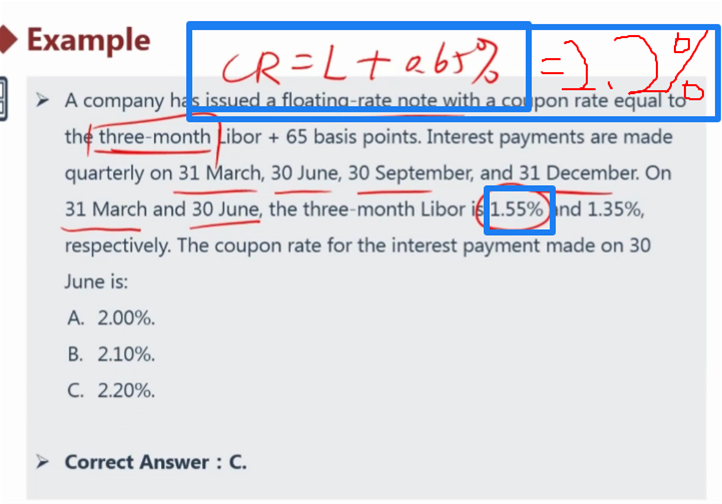 已回答请问,图1中的coupon rate是10%,解题时因为问的是half-year,所以10%除以2,我的问题是:图2中LIBOR为什么不先除以3,然后再 +65 basis point呢?题中也说了是three-month 。谢谢。