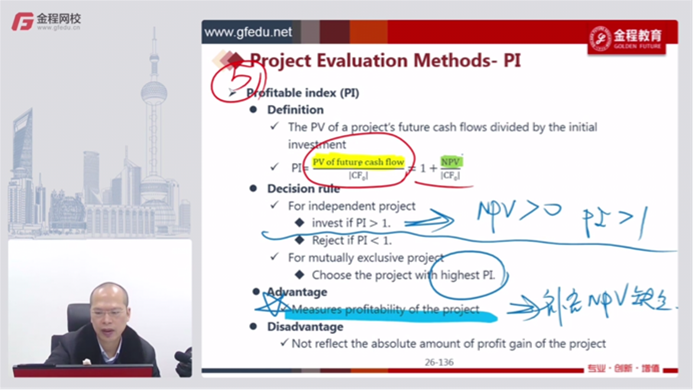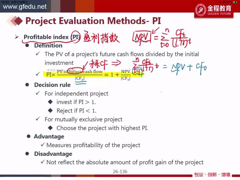 老师,这个公式分子的推导过程中,为什么PV of future cash flow=NPV+CF0,NPV的公式中,NPV=CF0+未来现金流的现值求和,那反过来就应该等于NPV-CF0啊,这里不是很懂