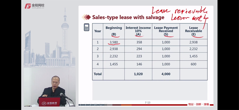这不是出租人的资产嘛?为什么还有利息?为什么要减去出租支出?sales-type lease with salvage 这张表是现在承租人的角度考虑的?