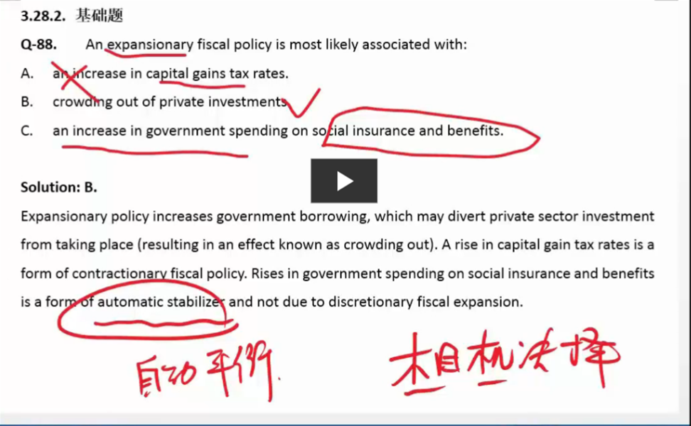 Q88视频里讲到所得税也是automatic stabilizer,但是A选项也说明了可用调整税收作为fiscal policy,是discretionary,请问这两种说法是不是冲突了,税收到底是相机抉择还是自动平衡呢