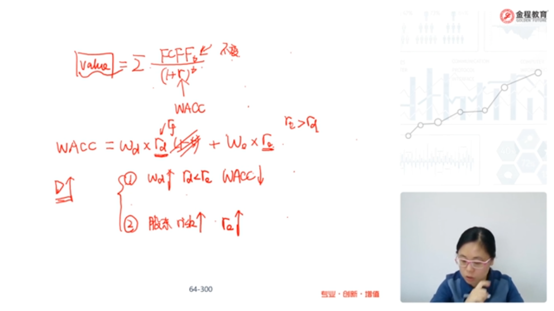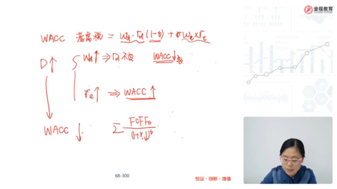 这里老师说×(1-t)后wacc的下降相比于re上升使得wacc上升更多一下,这是为啥,(1-t)<0啊,那×(1-t)的话,不是会是前面一项的小么?然后wd上升少了,那么wacc下降不是应该少了么
