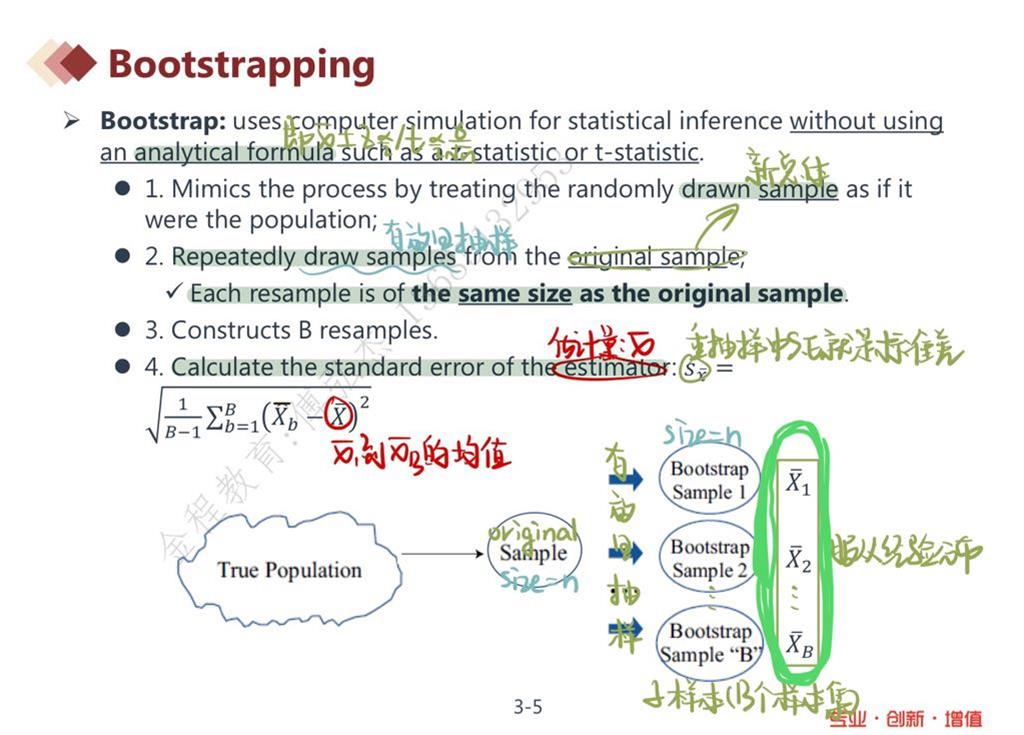 老师,自助法是不是把图中画圈的B个X拔的均值作为估计量,用这B个X拔的均值去估计true population的总体均值?
