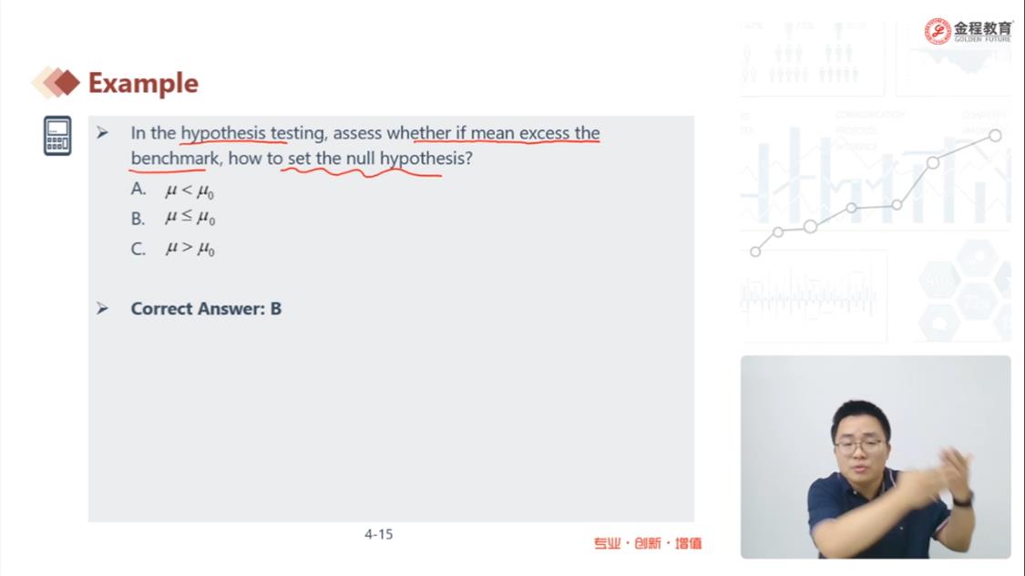 老师,这题不是说要评估mean是否大于benchmark吗,也就是说研究员正在怀疑μ>μ0这件事,书上说研究者怀疑是否成立的是原假设,那原假设不应该是μ>μ0吗?
