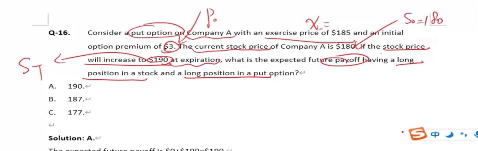 这题long stock不用扣除买股票的成本180或者$3的期权费?