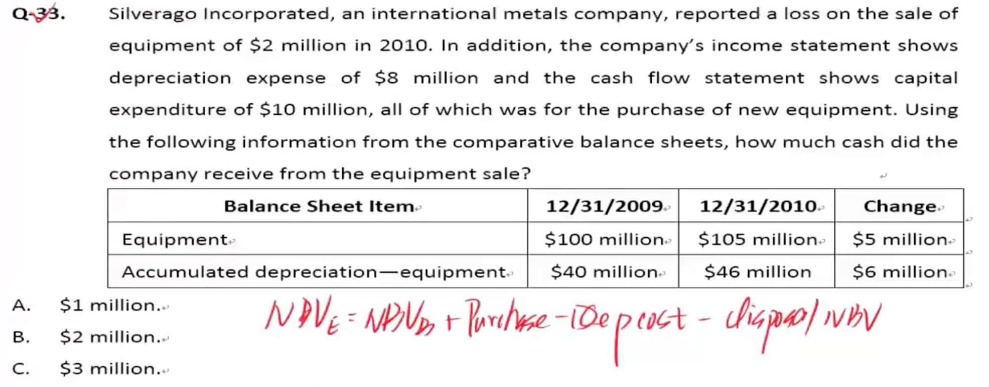 为什么Q33题里下面表格里的2010年和2019年的accumulative depreciation- equipment的差值6million和上面题目里的depreciation expense 的8million不符合呢?