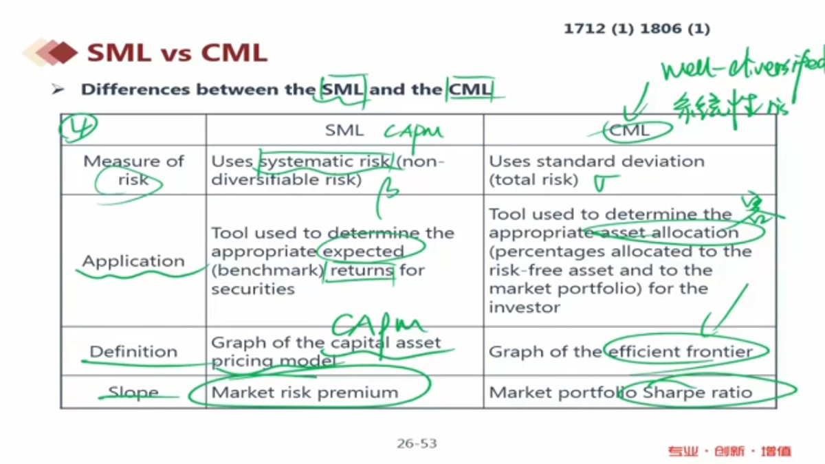 究竟是cml能 well分散还是sml,是不是说反了?sml不是camp模型吗,只有系统性风险?cml是总体风险,应该是不能完全分散啊?老师后面讲四个评价指标是说的treynor ratio完全分散,前面又说cml完全分散