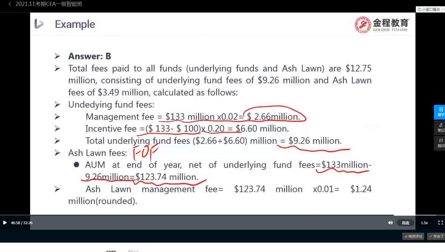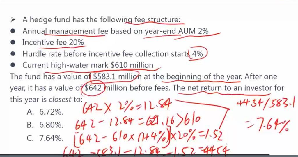 老师,1)我不明白为什么这里算incentive fee的时候没有减去management fee?一般不都是期末值-期初值- management fee-hurdle rate嘛?2)是不是如果有high water mark,算incentive fee里的hurdle 部分都是high water mark✖️hurdle rate,而且这里的期初值也变成了water mark?(当然我知道算incentive的前提是:期末值net掉management fee超过high water mark才有incentive)3)high hurdle rate和soft hurdle rate有什么区别?我看题目有的加了了soft有的加了了hard,有的什么也没有给就是一个hurdle rate,感觉在计算上没啥区别?