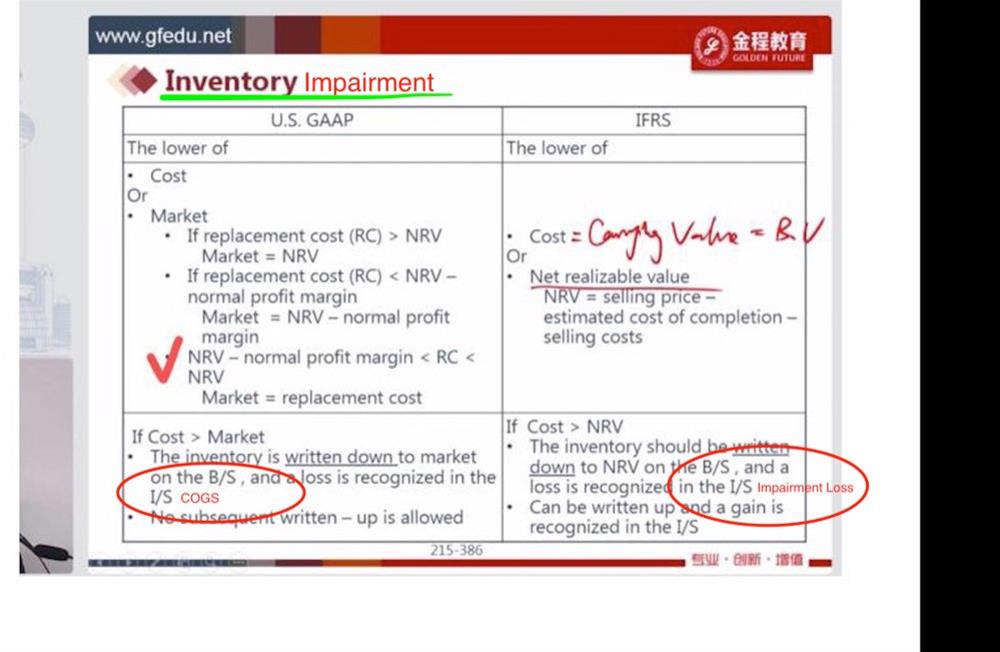 绿色圈圈里面的补充对吗:USGAAP下,存货减值计入COGS;IFRS下,存货减值计入impairment loss?