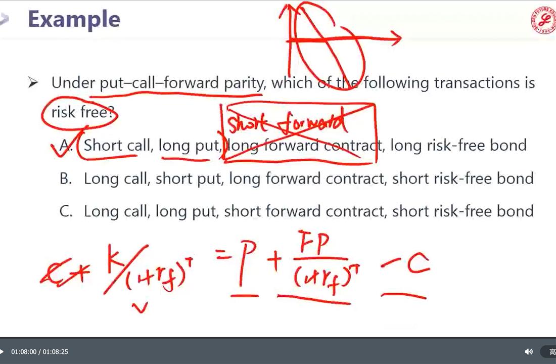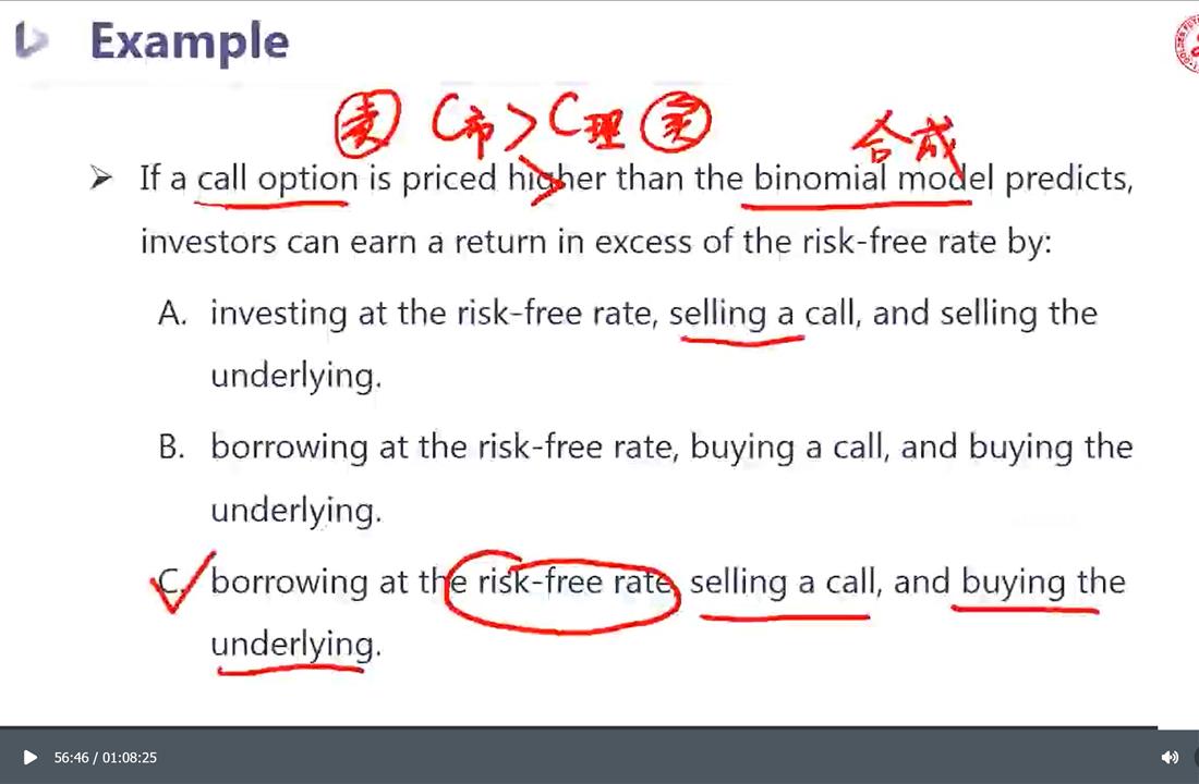 老师,1. 能否补充下所有的衍生品replication的情形和原理?课听了无数遍也没听明白。。。也可能是老师觉得大家都应该会了,讲的太快?买卖权平价理论听懂了,它们是一回事吗?2. C选项的selling a call卖的是市场价的call?实际操作中,先买入call和合成的东西,然后卖出刚刚买入的call?除非投资人手上已经有那个call了?实际操作是什么样的?谢谢!