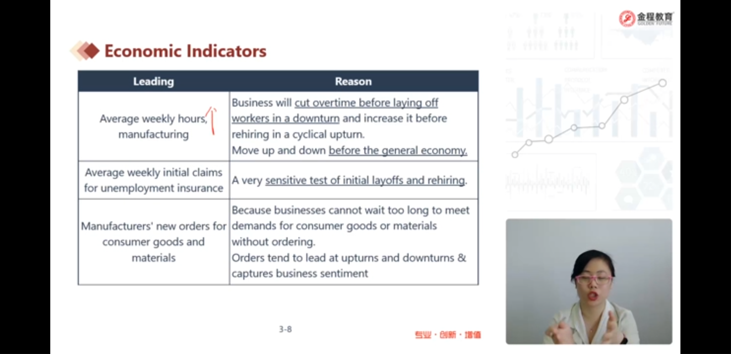 他到底在讲个什么东西??我经济学听到这里已经想吐了。我需要知道的是average weekly hour变动和经济形势的关系吗?重点是这个吗?我想要知道的是为什么average weekly hour是leading indicator而不是lagging indicator?为什么不是先经济转好了,然后要增加工作时长呢?
