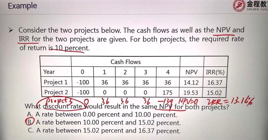 老师,1。这题为什么这么做呢?我想不到这么做呀,背后有什么思维逻辑引导到这个解题思路吗?2。我用计算器按了一遍0,四个36,一个-139,计算出的IRR是13.16%没错,可是这样计算出来的NPV是一个其他的数字,不是0哇,这又是为什么呢?谢谢老师!