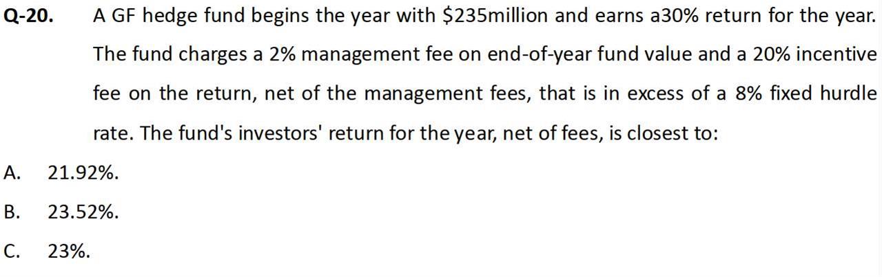 请问本题中若本基金的High water mark,历史最优业绩就是235*0.3=70.5,此时incentive fee该是多少?若历史最优业绩是235*0.2=47,此时incentive fee该是多少?