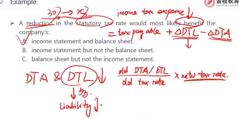 1. 公式里的old DTA or DTL/old tax rate得出来的是什么东西呢?我能否这样来记忆:old DTA or DTL/old tax rate=new DTA or DTL/new tax rate? 2. 图二三,老师讲是讲错了吧?从Yr2到Yr3,DTA明明是从1557上升到17606的是递增啊,而DTL是从39040下降到32603,为什么说DTA和DTL一样是递减的呢?