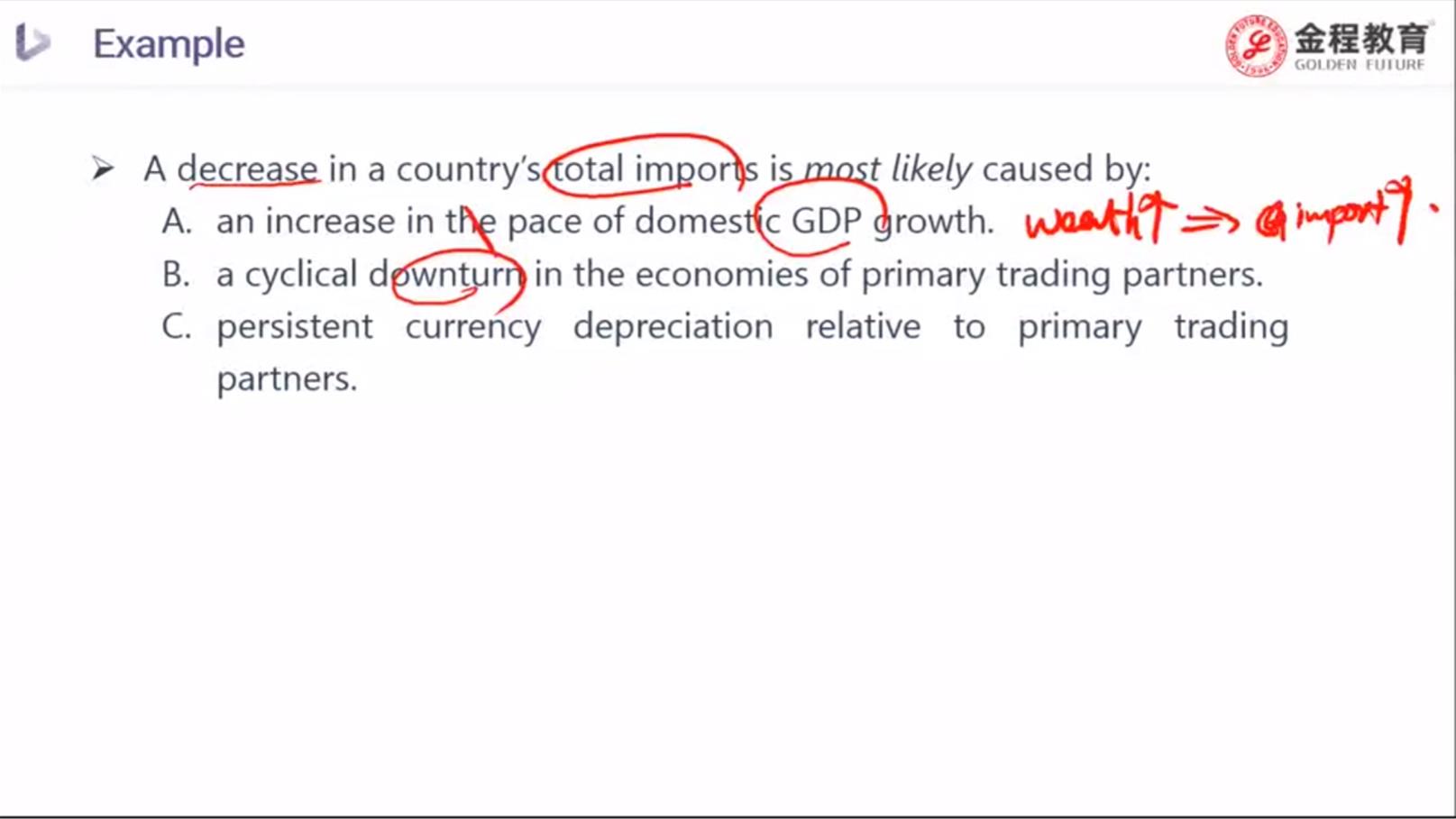 B选项,对手国家经济下行不是会导致降价,对于我国来说不是就利于进口了吗?