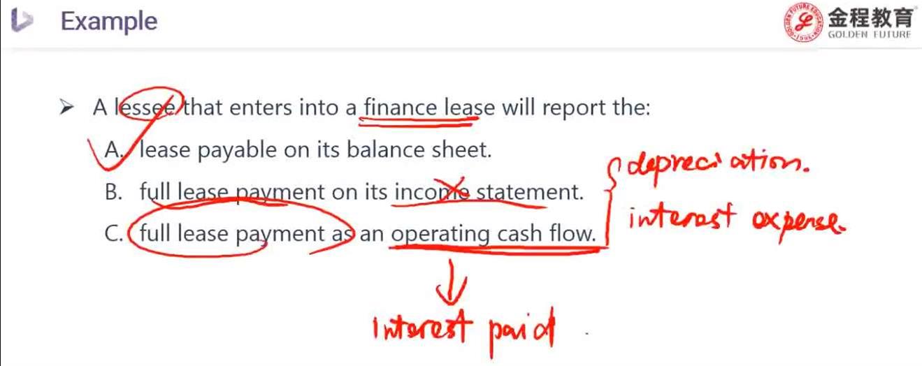 老师好,请问题里不是问 lesse的角度吗,出租人不是剔除了资产,B项还要算折旧吗?而且应该确认interest income而不是interest expense?而C项的interest paid也应该改为interest received?