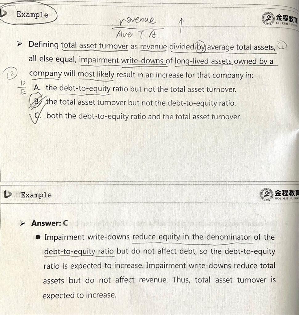 老师,1,revenue divided by average total assets不是TA/revenue的意思吗?被TA除?这句话怎么正确理解?2,impairment减值导致资产下降,怎么知道equity一定下降?