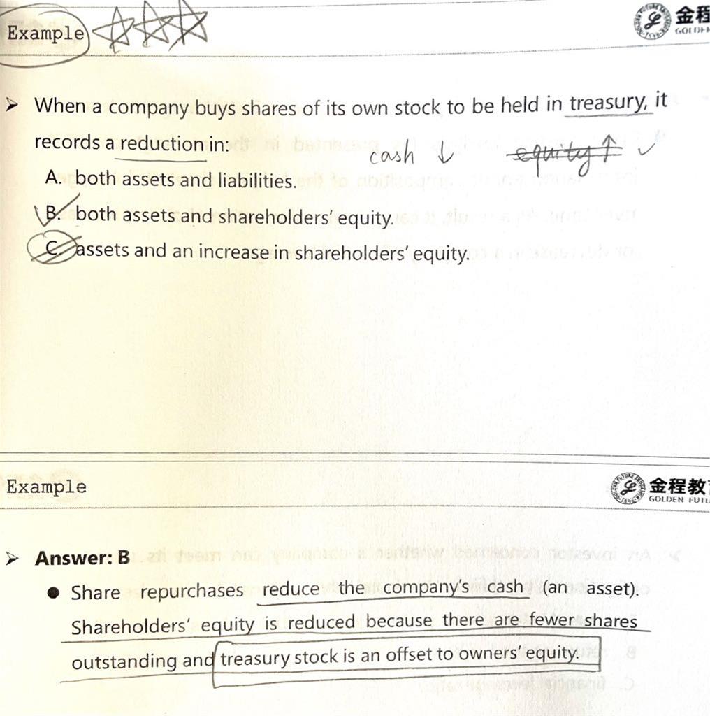 老师,treasury stock是近似于把钱还给了股权人吗?如果不是,哪个项目有这个功能?还有,为什么equity减少呢?它买回来不再作为公司权益的一部分了吗,那么它去了哪里呢?