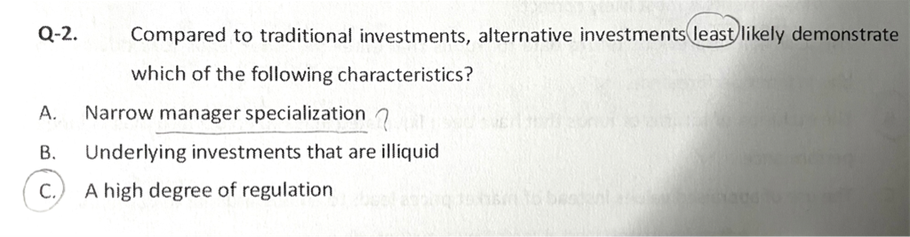 老师,这里的A选项什么意思?不理解,另外,搞另类投资的基金经理不是需要更强的专业性吗?为什么是narrow?谢谢!
