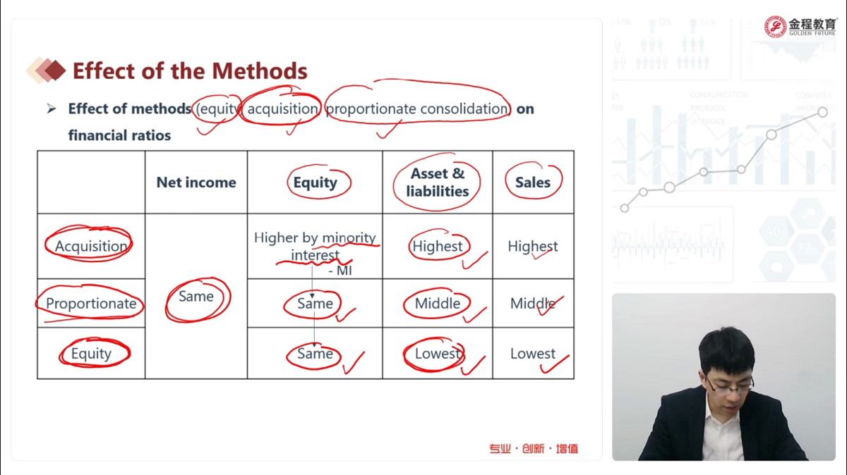 老师,权益法sales不是在利润表确定投资收益吗,为什么sales最低,不是应该和按比例合并差不多?前面股权收购逻辑不理解,可以详细说一下吗