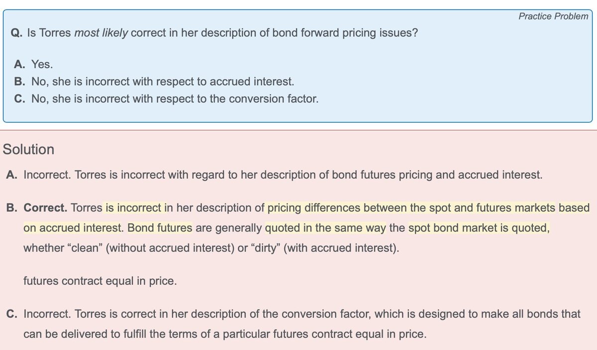 老师好,不太理解这道题目里为什么is incorrect in her description of pricing differences between the spot and futures markets based on accrued interest. 请详细解释Bond Futures的报价和Spot Bond Market的报价有什么相同和不同之处以及联系。“Typically, bond futures are quoted with pricing that reflects interest accrued since the last coupon payment. Therefore, in markets where spot prices are quoted “clean” rather than “dirty,” there can be some disconnect between spot and futures prices.”为什么题目中这么陈述是错误的?