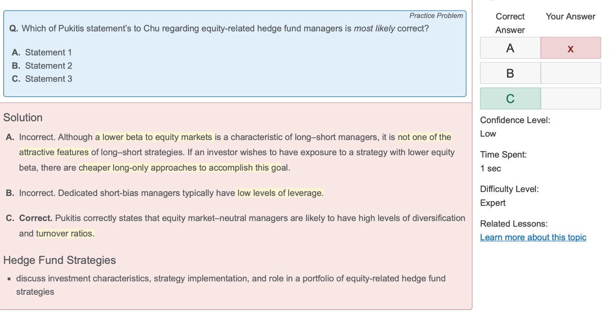 老师好,不太理解这道题的statement1和3。为什么解析里说A选项:cheaper long-only approaches 能够和long-short equity strategy有同样的lower equity beta?应该long-short equity strategy能产生更低的beta risk吧?以及statement3中equity market–neutral strategy是如何产生diversification?其中提到的turnover ratio具体指的是什么?为什么会更高?请老师详细解释。