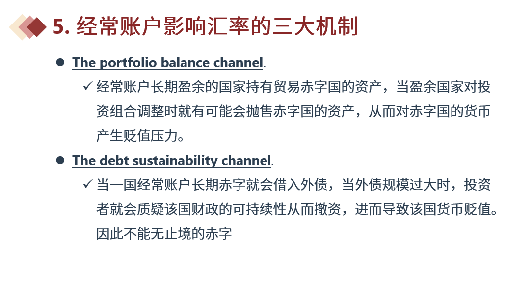 同学你好,这里就牵涉到经常账户影响汇率的三大机制了,这三大机制的结论都是经常账户盈余导致本币升值,经常账户赤字导致本币贬值,只不过三者是通过不同的角度去解释原因的,具体内容我总结在下图了,可以参考。