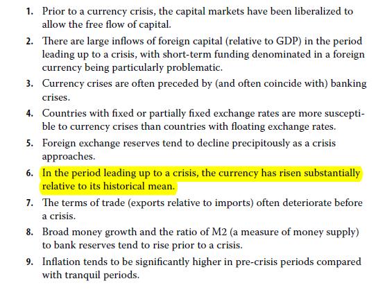 同学你好,该货币的汇率会显著高于平常时期,指的就是该货币会显著升值,而货币的大幅升值的确是货币危机的预警信号之一,所以prediction 3的说法是正确的。