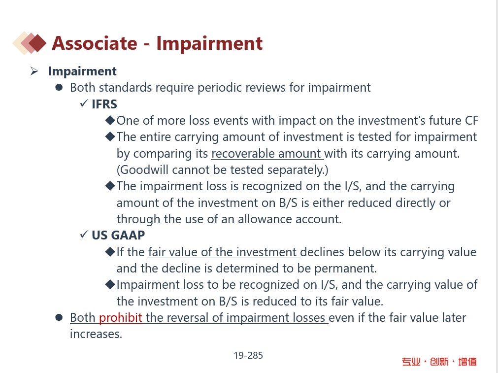 冲刺笔记财报M1中,企业投资减值,在IFRS下,carrying value > fair value,企业需要做减值损失,此时减值损失直接计入I/S,或者记入备抵账户(allowance account),在IFRS和USGAAP下,如果企业投资在i/s中做了减值损失,不能进行回转。那么在IFRS下,如果企业投资记入备抵账户,当资产升值时,是否可以重新回转?
