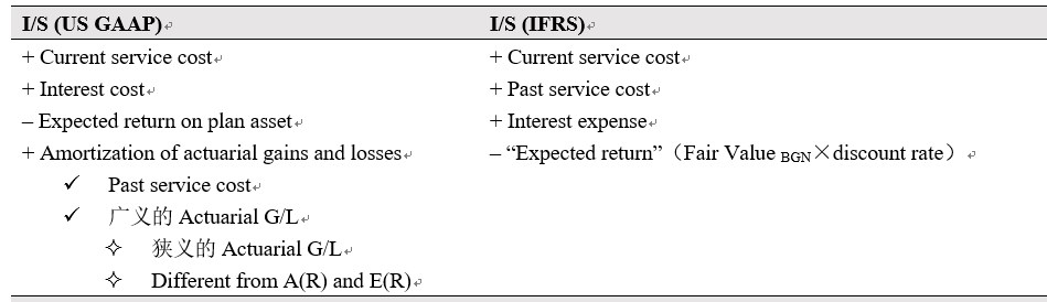 在财报M2养老金中,operating cost如何计算,这样理解是否正确?①在USGAAP下的I/S中,operating cost = Current Service Cost + Amortized Past Service Cost + Amortized Actural Gain / Loss;②在IFRS下的I/S中,operating cost = Current Service Cost + Past Service Cost?