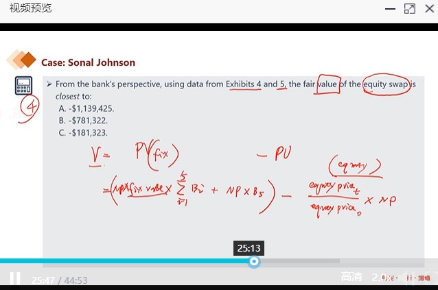 Equity swap 的两端分别是 收固定(债券收益)和支浮动(股票收益),对应以上老师板书红色的笔记