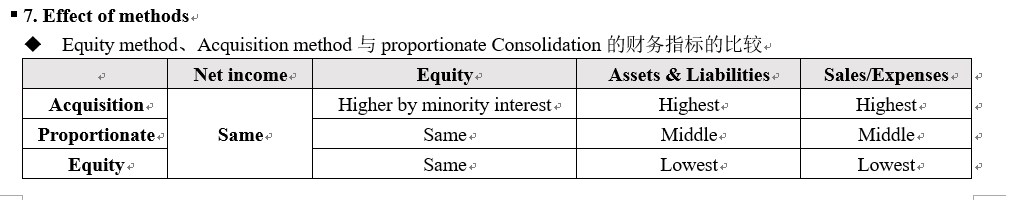 并表时,虽然I/S完全合并,NI先全加上,但是对于NI,还会再单独确认一项是归属于少数股东的NI,属于减项,导致最终NI和equity method下是一样的。