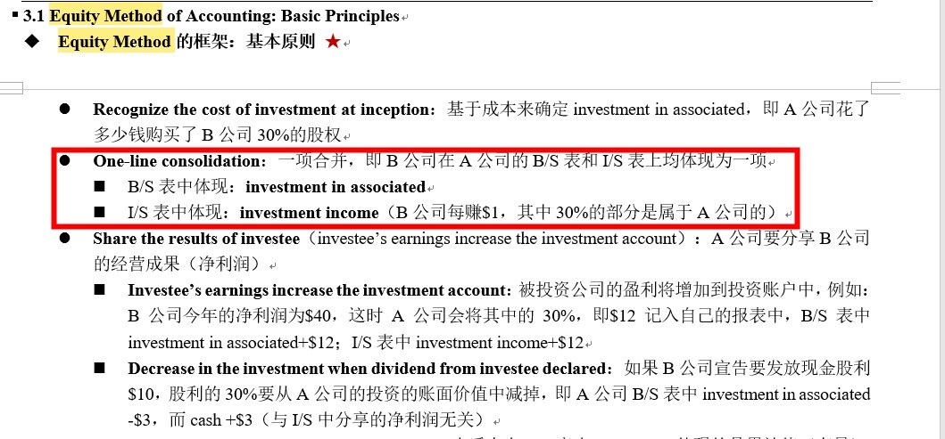 equity method不会合并存货科目。他在B/S和I/S都只是一项合并。