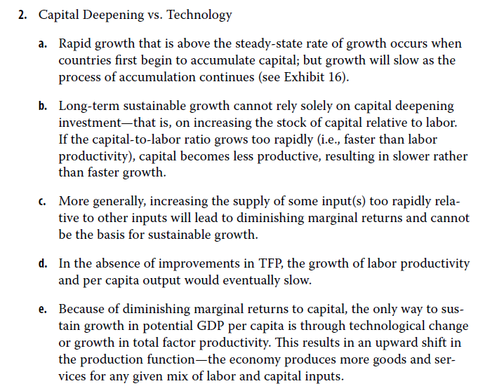 同学你好,注意题目条件,它已经明确说明是基于新古典增长理论来回答了,那就可以不需要想多,根据教材规定,资本投入所带来的产出是存在边际递减效应的,唯一能够保持人均产出增长的因素只有TFP,也就是技术进步,那这里就直接选B即可。